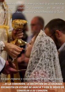 La devoción al Corazón Inmaculado de María consiste sobre todo en la comunión reparadora. Se trata de la expresión más importante de nuestro amor en calidad de pecadores arrepentidos. Cuando amamos intensamente a alguien y, por desgracia, y verdaderamente sin querer, le ofendemos gravemente, deseamos entonces poder volver atrás. Hacemos lo que sea para demostrarle cuánto lamentamos haberle ofendido. Disculparse, borrar lo mejor posible el mal cometido mediante palabras y actos, ¡he aquí la reparación! Cuando alguien recibe la sagrada Comunión en este espíritu de reparación por los pecados cometidos contra el Corazón Inmaculado de María, se halla entonces ante Cristo, quien es el más afectado cuando se insulta a su amadísima Madre. En este momento, podemos realmente intentar consolarle por este deseo de reparación y, a cambio, María nos guiará hacia las mejores disposiciones para recibir a su amado Hijo.