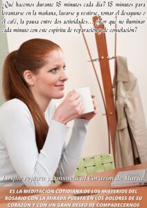 Los primeros quince minutos del día se pueden ofrecer para consolar al Inmaculado Corazón de María, y la oración de la tarde se puede unir con la oración de la Sagrada Familia de Nazaret al final del día. Cualquiera que sea su intención precisa para estos quince minutos, lo cierto es que este momento tiene una importancia en nuestra agenda diaria. De la misma manera, estos quince minutos son importantes para nuestra vida espiritual, porque iluminan cada uno de nuestros días. En otras palabras, esta meditación santifica nuestro día y nos recuerda la presencia y protección de Nuestro Señor y Nuestra Señora.