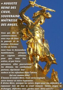 Auguste Reine des cieux, souveraine Maîtresse des Anges, vous qui, avez reçu de Dieu le pouvoir et la mission d’écraser la tête de Satan, nous vous le demandons humblement, envoyez les légions célestes pour que sous vos ordres et par votre puissance, elles poursuivent les démons, les combattent partout, répriment leur audace et les refoulent dans l’abîme.” Qui ut Deus ? – Qui est comme Dieu ?