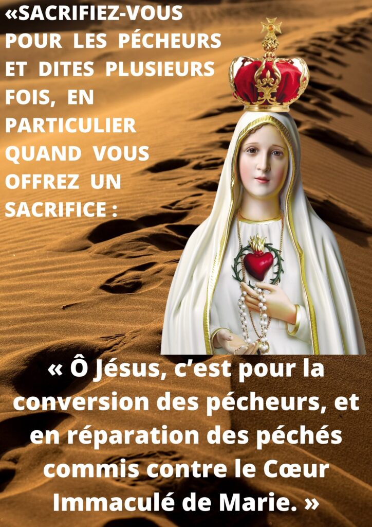 A Fatima, la Vierge Marie nous a encouragé à une pratique particulière, plus spécialement adaptée à notre temps : la dévotion aux cinq premiers samedis du mois. Celle-ci consiste dans les œuvres suivantes :