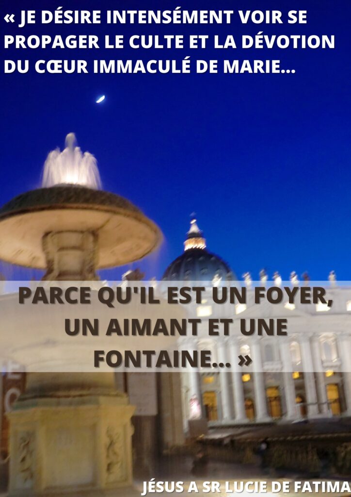 C’est à cela que doit nous conduire la dévotion au Cœur Immaculé de Marie, et c’est cela qui pourra hâter la venue du règne du Christ, par le règne du Cœur de Marie. Ce règne doit commencer en chacun d’entre nous.
