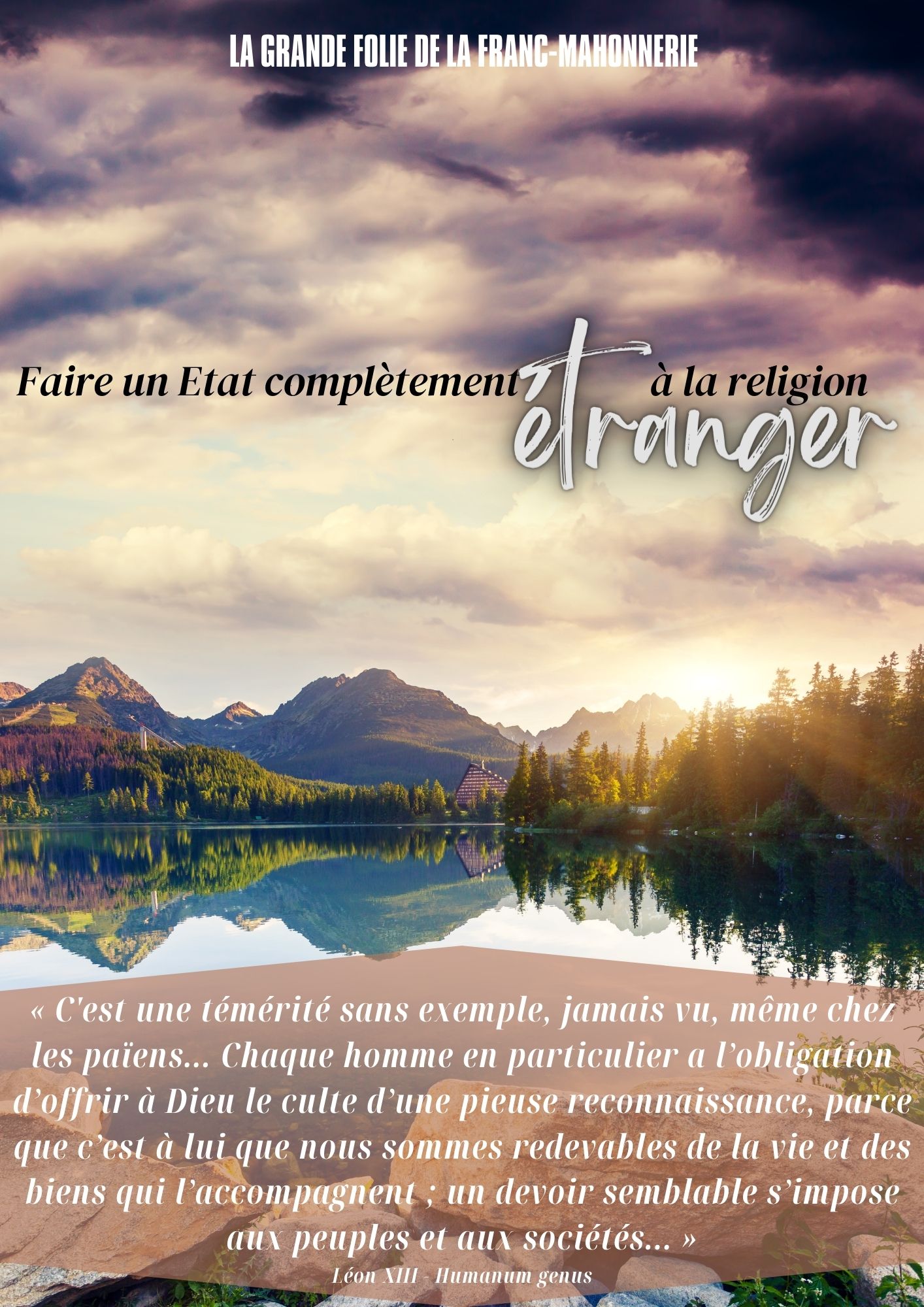 Quant à la prétention de faire l’Etat complètement étranger à la religion et pouvant administrer les affaires publiques sans tenir plus de compte de Dieu que s’il n’existait pas, c’est une témérité sans exemple, même chez les païens. Ceux-ci portaient si profondément gravée au plus intime de leur âme, non seulement une idée vague des cieux, mais la nécessité sociale de la religion, qu’à leur sens il eût été plus aisé à une ville de se tenir debout sans être appuyée au sol que privée de Dieu. De fait, la société du genre humain, pour laquelle la nature nous a créés, a été constituée par Dieu autour de la nature. De lui, comme principe et comme source, découlent dans leur force et dans leur pérennité, les bienfaits innombrables dont elle nous enrichit. Aussi, de même que la voix de la nature rappelle à chaque homme en particulier l’obligation où il est d’offrir à Dieu le culte d’une pieuse reconnaissance, parce que c’est à lui que nous sommes redevables de la vie et des biens qui l’accompagnent, un devoir semblable s’impose aux peuples et aux sociétés.