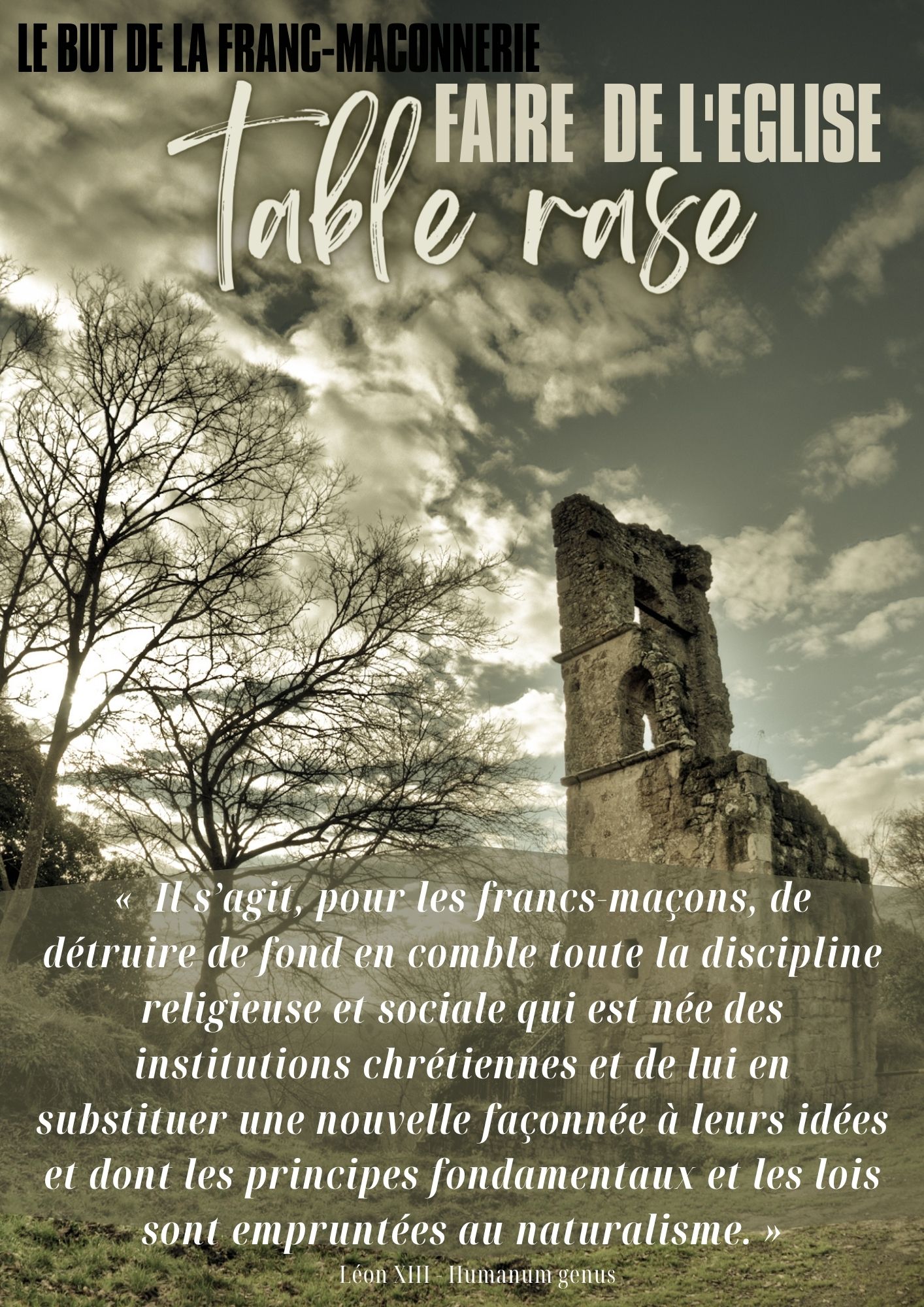 - Au nom du naturalisme, la Franc-maçonnerie veut détruire tout ce qui se rapporte à la religion catholique d’où leur priorité à séparer l’Eglise et l’Etat – On réduit presque à rien la liberté d’action de l’Eglise – Les membres déistes de la FM servent aux plans maçonniques par leur apparent attachement à l’Eglise