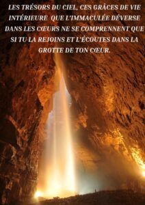 La Voyante prit le papier, l’encre et la plume qu’on lui tendait, et s’avança vers l’Apparition, dont le regard maternel l’encouragea en la voyant approcher. Pourtant, à chaque pas que faisait l’enfant, l’Apparition reculait peu à peu dans l’intérieur de l’excavation. Bernadette la perdit de vue un instant et pénétra sous la voûte de la Grotte d’en bas. Là, toujours au-dessus d’elle mais beaucoup plus près, dans l’ouverture de la niche, elle revit la Vierge rayonnante.