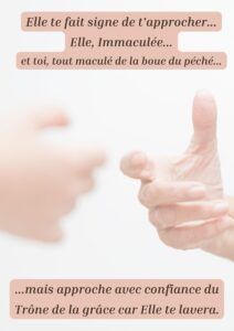 D’un geste grave et doux, la Dame fit Elle-même, comme pour encourager l’enfant, le signe de la Croix. Et la main de Bernadette, se soulevant peu à peu comme invisiblement portée par Celle que l’on nomme le Secours des Chrétiens, fit en même temps le signe sacré.
