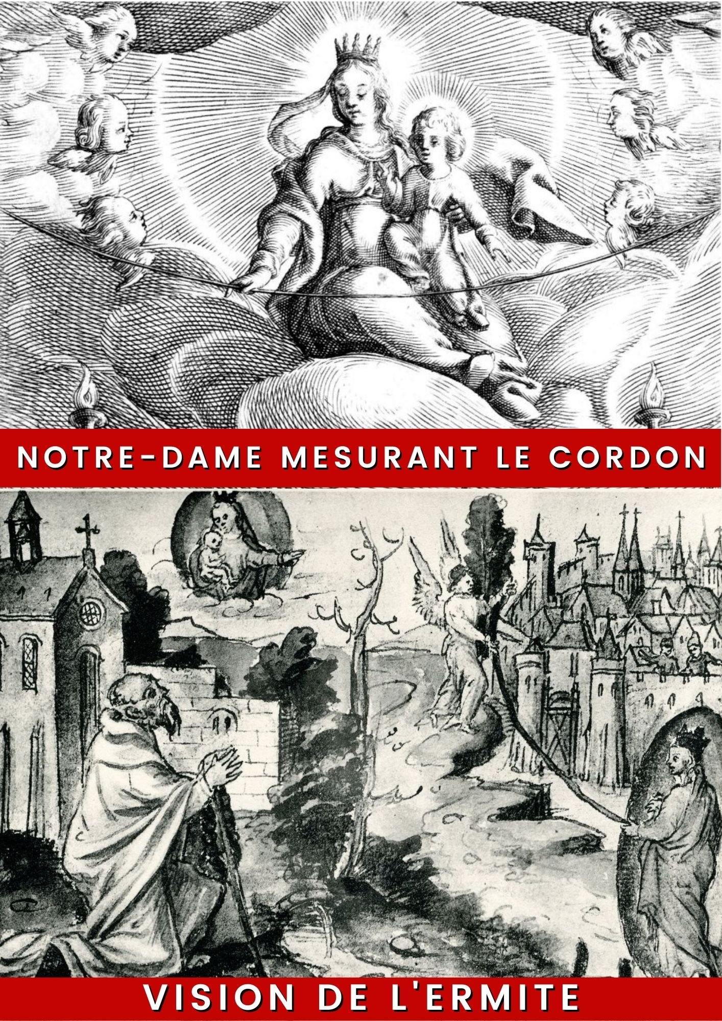 Réunis sur les murailles, les quinze mille villageois virent tout à coup les ténèbres se dissiper, la nuit se changer en jour radieux, tandis qu’apparaissait à leurs regards émus une Reine majestueuse, ravissante de beauté, entourée d’un nombreux cortège d’anges, semblant venir de la chaumière de l’ermite et stationnant au-dessus de la chapelle du Neuf bourg, dédiée à la mère de Dieu par l’empereur Charlemagne. Elle tenait en main une pelote de cordon écarlate.
