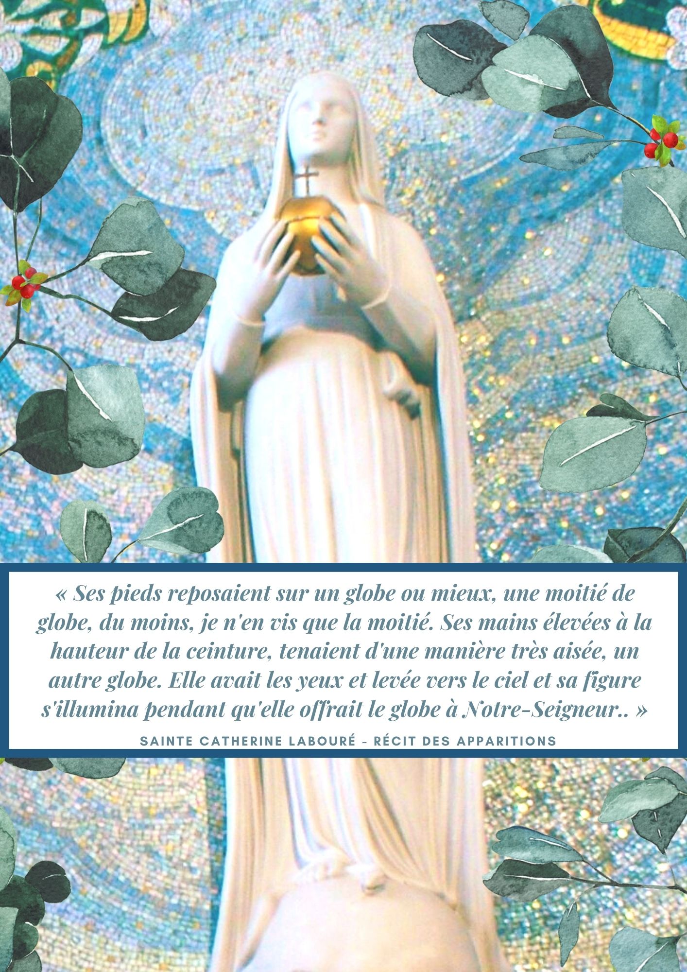 Je ne saurais dire ce que j’éprouvais ni tout ce que j’ai appris en si peu de temps. Comme j’étais occupée à la contempler, la Sainte Vierge abaissa les yeux sur moi et une voix me dit au fond du cœur : « Ce globe que vous voyez représente le monde entier et particulièrement la France, et chaque personne en particulier. »