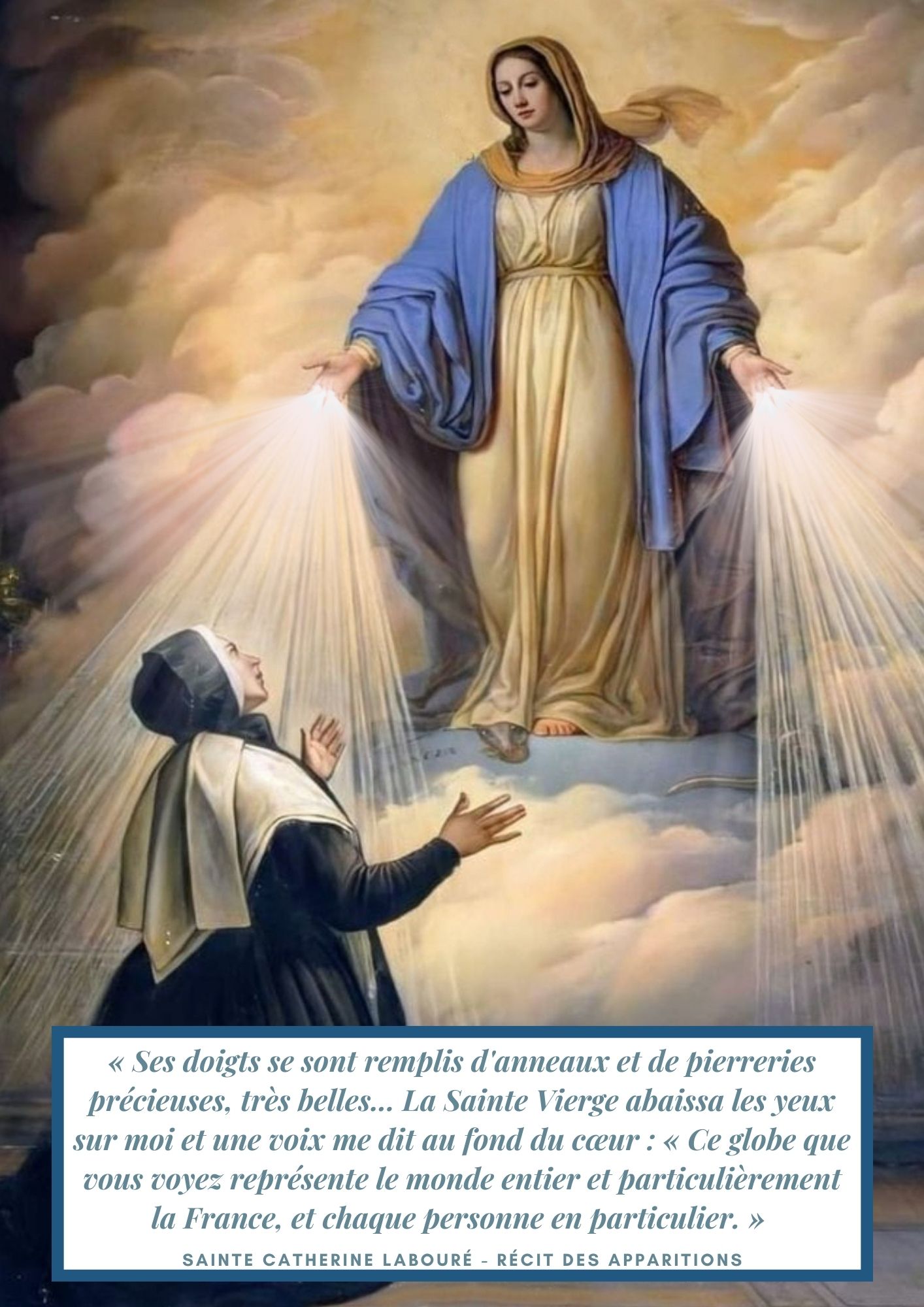 Catherine crut entendre une voix qui disait : « Ces rayons sont le symbole des grâces que Marie obtient pour les hommes et le point vers lequel ils tombent plus abondamment, c’est la France.
