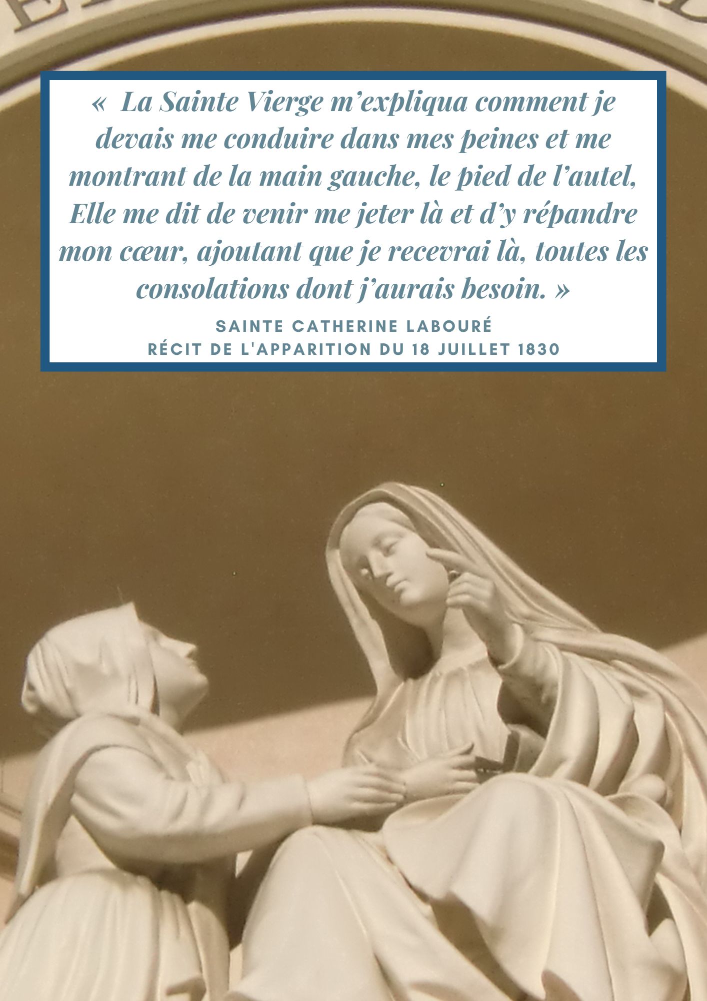 « En ce moment, dit-elle, je sentis l’émotion la plus douce de ma vie et il me serait impossible de l’exprimer. La Sainte Vierge m’expliqua comment je devais me conduire dans mes peines et me montrant de la main gauche, le pied de l’autel, Elle me dit de venir me jeter là et d’y répandre mon cœur, ajoutant que je recevrai là, toutes les consolations dont j’aurais besoin. »