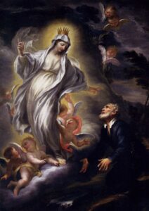Il s’agenouille, joint ses mains dans la prière, et là, le miracle se répète. Le ciel s’ouvre et une lumière intense et éblouissante repose sur une pierre du ruisseau, et prend peu à peu la forme d’une Dame, toute vêtue de blanc, couronnée d’or brillant, les mains tendues et agrandies dans un geste de douce miséricorde.