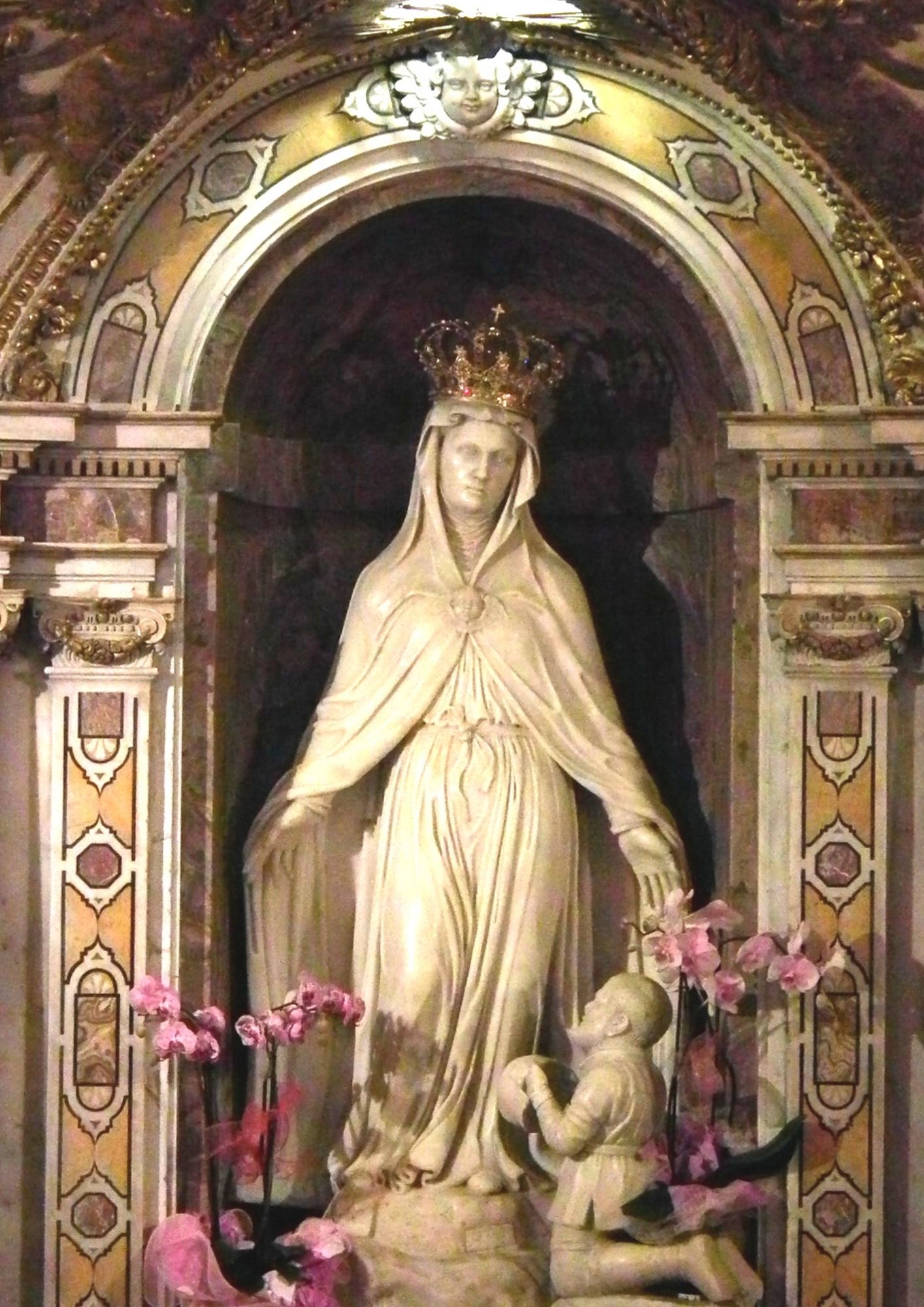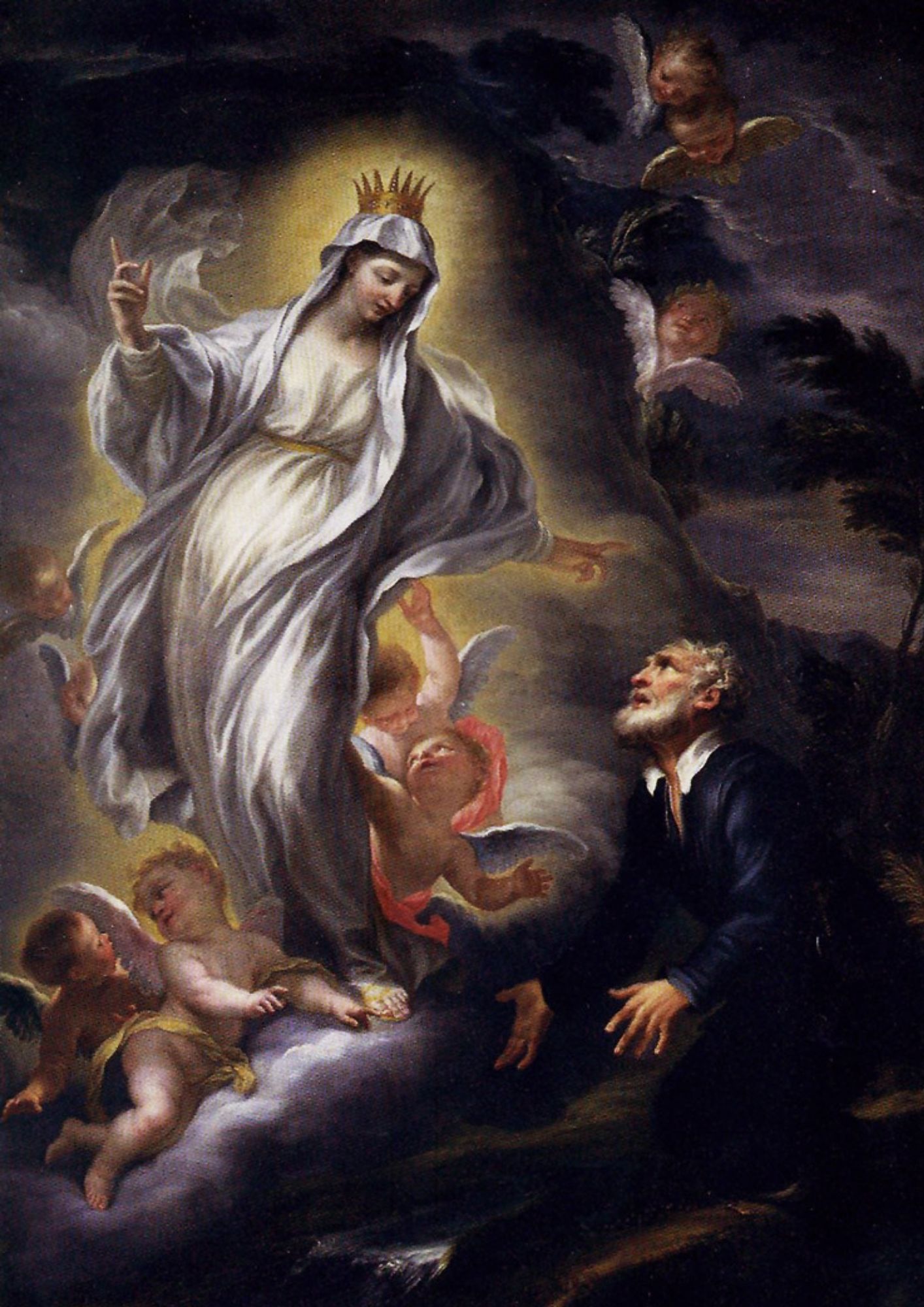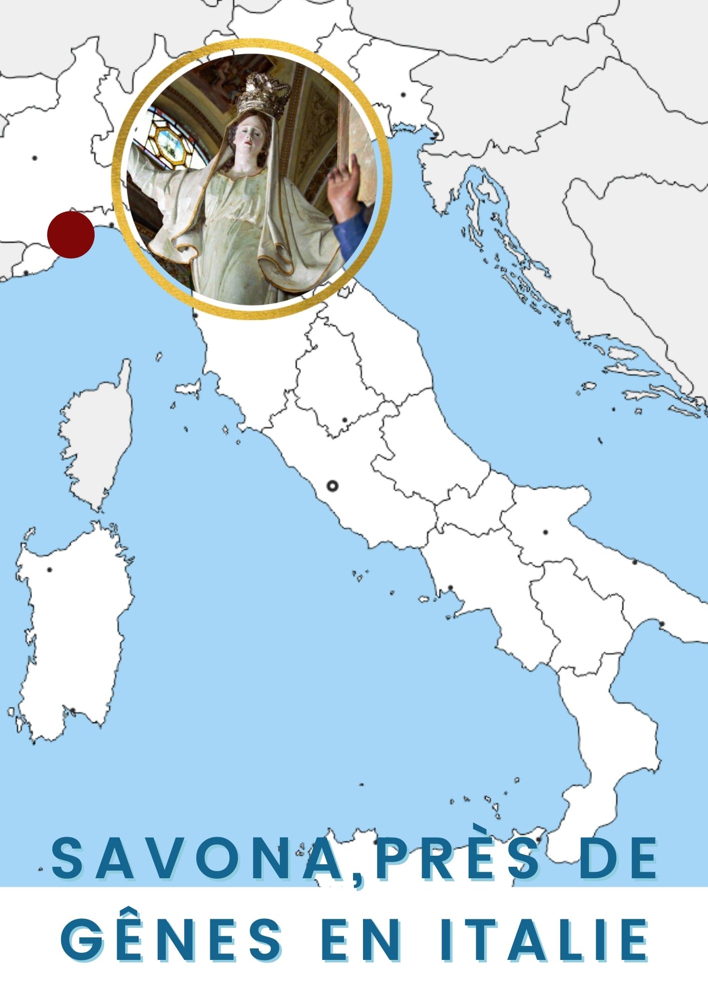 La première apparition : Le samedi 18 mars 1536, Antonio Botta, un fermier originaire de la vallée de San Bernardo, à six kilomètres de Savone, se rend tôt le matin dans son petit vignoble pour finir la taille des vignes. En chemin, il récite, comme d’habitude, le Saint Rosaire; quand il atteint le petit ruisseau qu’il doit traverser, il pense à se rafraîchir dans ces eaux, et juste à ce moment-là, la Madone lui apparaît.