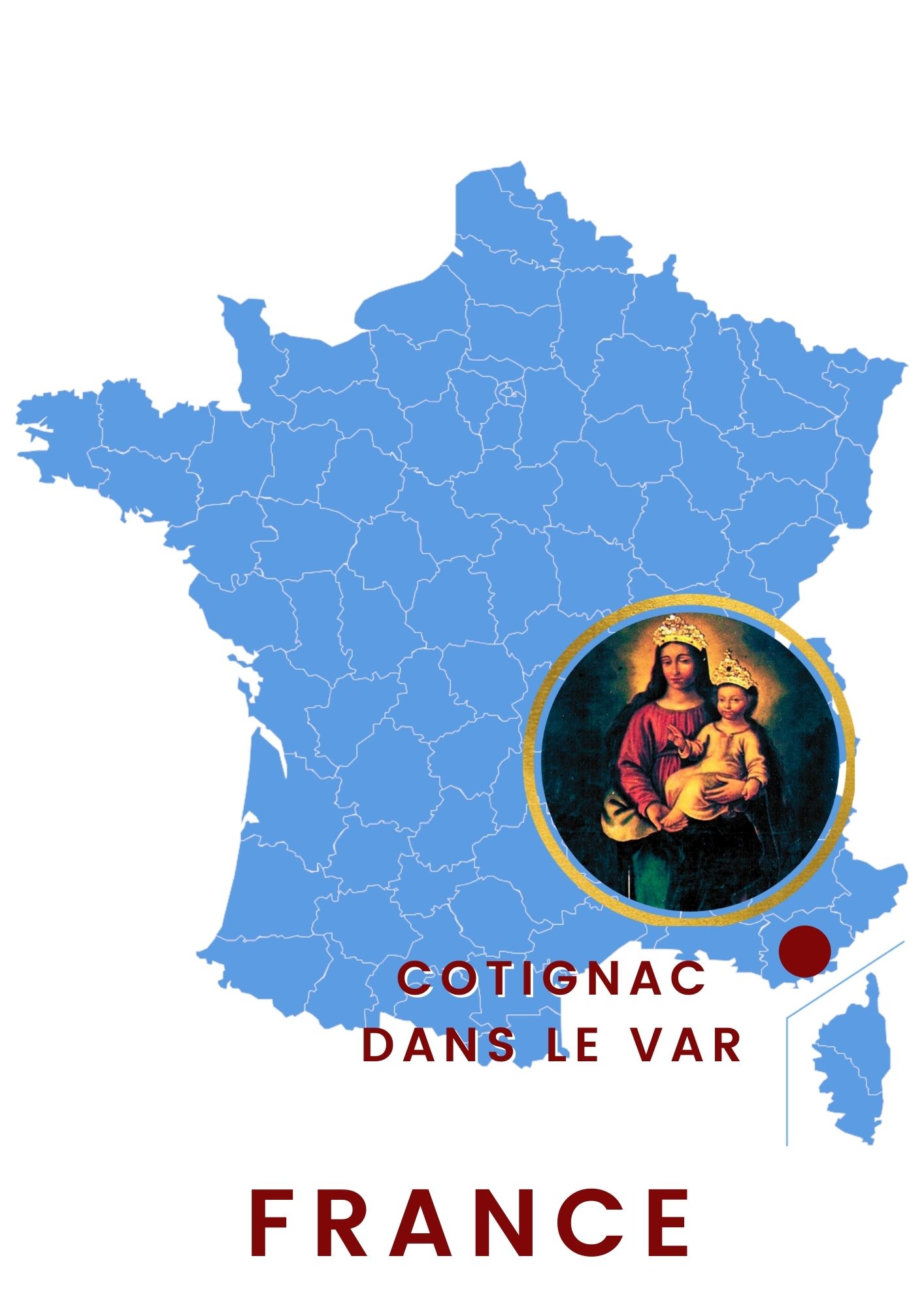 À Cotignac dans le Var, entre Brignoles et Draguignan 1519, un bûcheron nommé Jean de La Baume gravissait le Mont Verdaille. Dans un tourbillon de lumière, il vit la Vierge, l’Enfant Jésus dans ses bras, entourée de Saint Michel, de Saint-Bernard et de Sainte-Catherine. Il entendit très clairement la Vierge Marie lui dire :