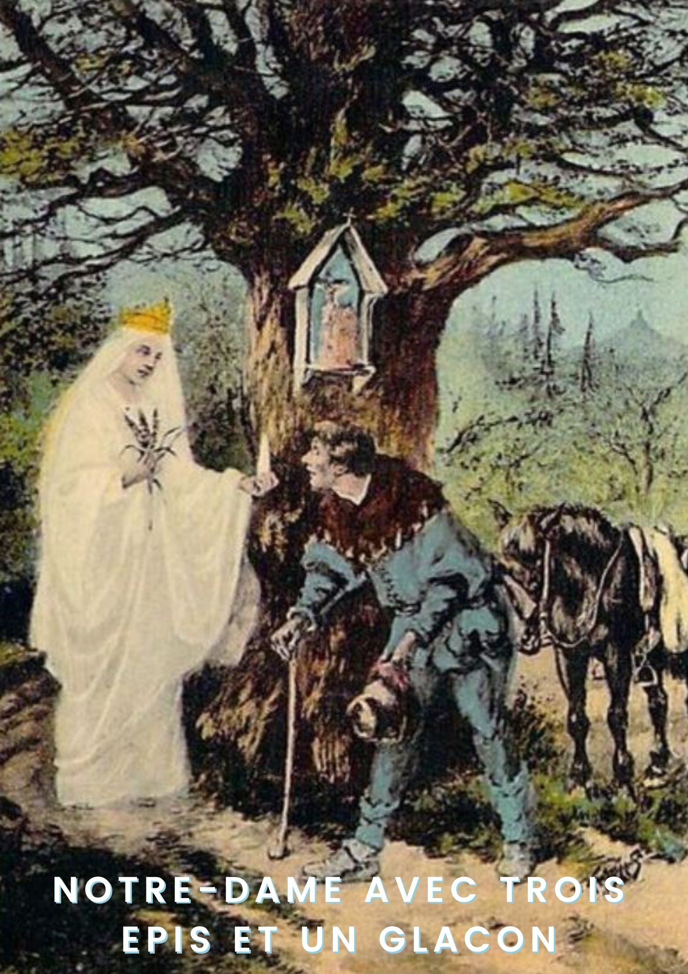 Le sanctuaire des trois épis ne comptait à l’époque, aucun édifice. C’était seulement une vaste forêt. Le 3 mai 1491, à 10h du matin, un forgeron du village d’Orbey nommé Thierry Schoeré, passait dans cette forêt pour se rendre au marché de Niedermorschwihr. Il s’arrêta au pied d’un chêne où une image de Jésus crucifié avait été suspendue en mémoire d’un faucheur qui s’était mortellement blessé à cet endroit. Il s’agenouilla devant l’image et fit une prière pour le repos de l’âme du défunt. À peine sa prière était-elle achevée, qu’il vit dans une grande lumière la Vierge vêtue d’une grande robe, d’un manteau, et d’un voile blancs. Dans sa main gauche elle tenait un glaçon, dans la droite trois épis sur une même tige. Elle dit au forgeron :