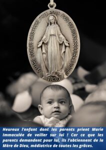 Tout à coup, elle s’évanouit, tombe à la renverse dans l’appartement et l’enfant tombe lui, sur les pavés en dehors. Naturellement, il devait être fracassé par une telle chute, mais non. Depuis que ses pieux parents avaient entendu lire le mandement de Monseigneur l’archevêque à l’occasion de la consécration de l’Église Notre-Dame de Lorette, dans lequel il est recommandé aux fidèles de porter la médaille miraculeuse, ils s’étaient empressés de se la procurer et de la faire porter à leur petit enfant. L’Immaculée ne laissa pas sans récompense cette attention de leur piété.