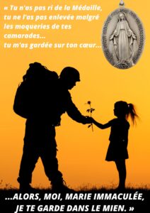 Quelques temps après, il revint avec une blessure à la tête. En voyant la sœur, il s’écria : « Ma sœur voilà la Médaille que vous m’aviez donnée, elle m’a sauvé la vie ! Quand nous étions à la bataille, le cordon par lequel elle était suspendue à un mon cou se cassa et pendant que les canons de l’ennemi faisaient feu sur nous, je l’attachai à un bouton de mon uniforme. Tous mes compagnons sont tombés mort à mes côtés et j’ai échappé avec cette petite égratignure.