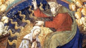 Tada je Kraljica po prvi puta uzela u posjed svoje prijestolje. Ona ima najviše mjesto u Nebu, najveću slavu, koja nadmašuje onu svih anđela i svetaca. Ondje Ona kraljuje kao kći Boga Oca, Majka Boga Sina i Zaručnica Boga Duha Svetoga. Ondje Ona djeluje kao Kraljica svih srdaca i Posrednica svih milosti. Ondje će Ona izvršiti Božju volju u odabranima sve do kraja vremena.