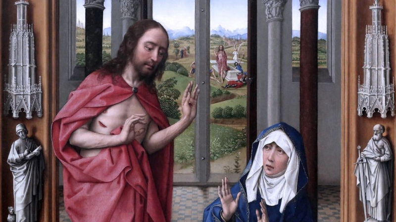 Uistinu, nikada nije mogla razdvojiti ove dvije slike, jer obje su bile dio onoga što je bilo stanje Njezinoga Sina: On je bio „crv, a ne čovjek, ruglo ljudima, prezir narodu“ (Ps 21, 7). Sada se „najljepši od sinova ljudskih“ (Ps 44, 3), vratio se kao prije Muke, pa čak i više, jer je uskrsnuo na neprolaznu slavu.