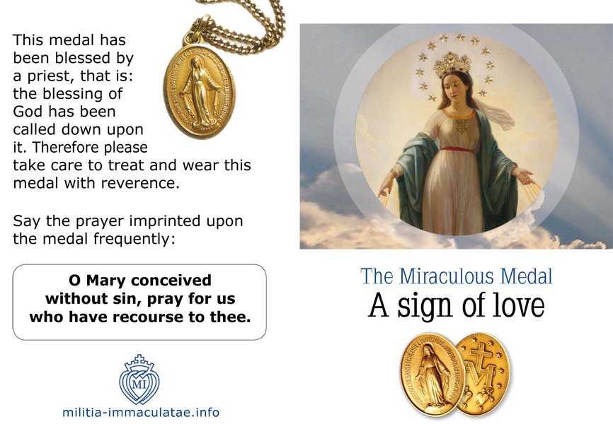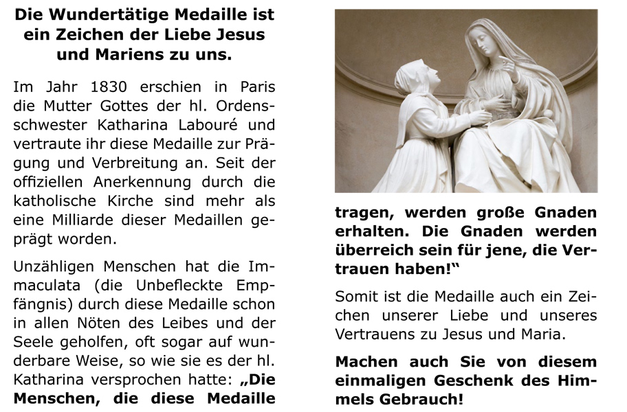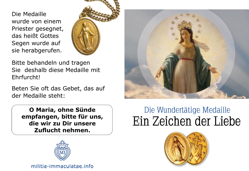 Questo volantino (formato DIN A7) si abbina utilmente alla Medaglia Miracolosa in quanto ne descrive l’origine e il significato.
