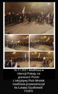 Jesteśmy grupą tradycji katolickiej oraz wiernymi kaplicy FSSPX w Chorzowie . Chcieliśmy poinformować o naszej inicjatywie promowania tradycji katolickiej w mieście Jastrzębie Zdrój i okolicy. Z miłości do Boga i wdzięczności za Waszą kapłańską posługę i niezłomność w tych zwariowanych czasach staramy się za Waszym przykładem pokazywać prawdziwą drogę do zbawienia. W załączniku przesyłamy kilka zdjęć z comiesięcznych pierwszych piątków miesiąca, kiedy w łączności z ks. Łukaszem Szydłowskim i wiernymi zgromadzonymi przed Archikatedrą Chrystusa Króla w Katowicach odmawiamy wspólnie Różaniec Święty pod krzyżem w naszym mieście. W październiku odmawialiśmy Różaniec co tydzień, w każdy piątek . W Wodzisławiu Śląskim zorganizowaliśmy również kontrmanifestację wobec marszu środowiska LGBT. Odmówiliśmy na rynku Różaniec po łacinie, a ku pokrzepieniu serc puszczaliśmy przez megafon chorały gregoriańskie. Część mieszkańców Wodzisławia przyłączyła się do naszej modlitwy. W dniu 16.11.2021, w święto Matki Boskiej Ostrobramskiej odmawialiśmy z inicjatywy Piotra Mrotka pod przewodnictwem ks. Łukasza Różaniec w intencji pokoju na granicach Rzeczypospolitej i przebłagania za wszelkie profanacje , bluźnierstwa i o odnowę moralną narodu polskiego.