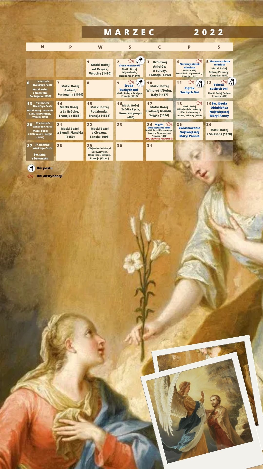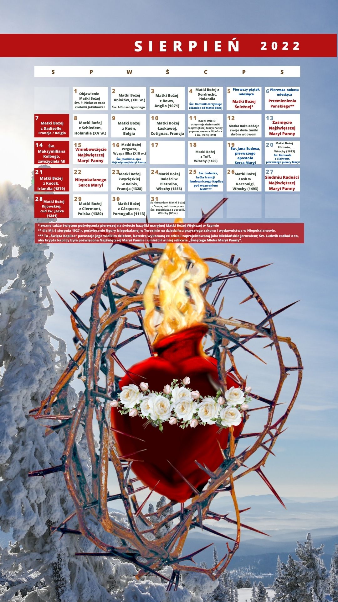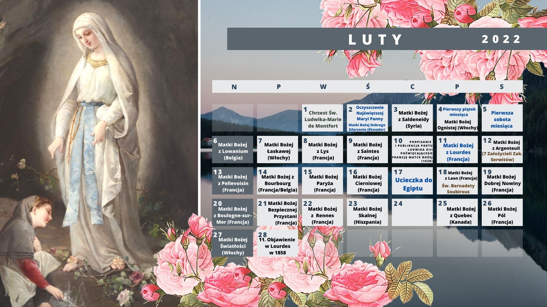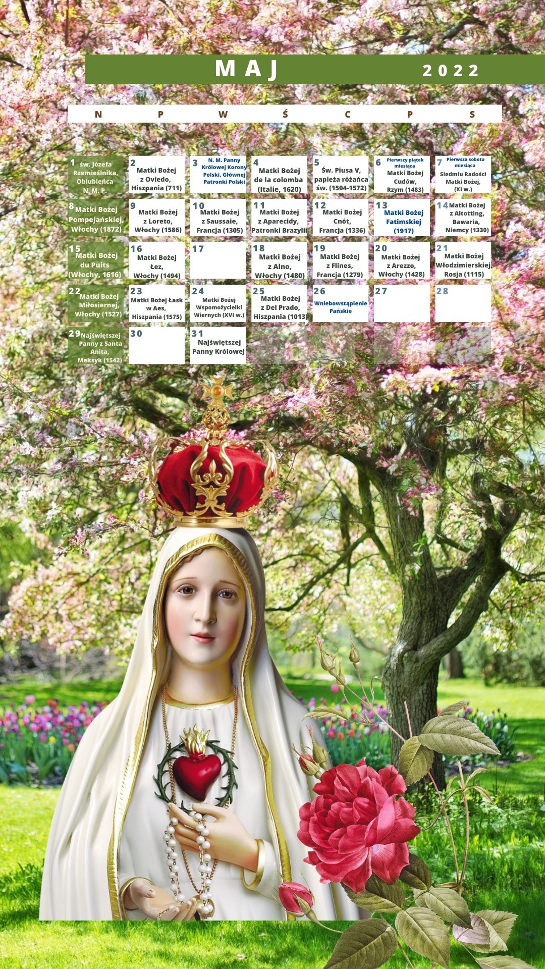 W tym Nowym Roku 2022 oferujemy kalendarz maryjny, specjalnie zaprojektowany dla komputera i w wersji do pobrania na ekran telefonu komórkowego (na dole tej strony). Jednak w tej chwili obie wersje nie są w żaden sposób publikowane w formacie papierowym.