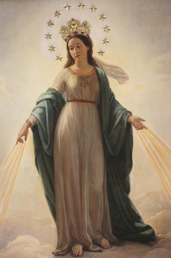 Powyżej: cudowny obraz z kościoła Sant’Andrea delle Fratte w Rzymie. To tutaj Maryja zdziałała w 1842 r. znany cud natychmiastowego nawrócenia żyda nazwiskiem Alphonse Ratisbonne, któremu się objawiła. Do cudu tego przyczynił się cudowny medalik, który nosił on przy sobie przez kilka dni ze względu na przyjaciela. Po objawieniu Ratisbonne poznał całą wiarę katolicką i został kapłanem. Św. Maksymilian odprawiał na ołtarzu przed tym obrazem swoją prymicję.