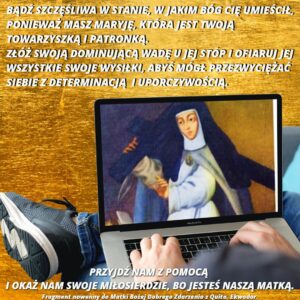 Rozważ, moja duszo, niezwykły przywilej tej błogosławionej siostry, która przez swoją wiarę, nabożeństwo i gorliwość w modlitwie, zasłużyła, by przyciągnąć obecność Najświętszej Maryi Panny, kontemplować Ją, tak kochaną, tak czystą i tak piękną, oraz być olśnioną przez Jej chwałę, cieszyć się Jej bliskością, a także słyszeć Jej przyjemny głos. Ach! Szczęśliwe stworzenie! Jak wielka była twoja miłość do twojej Niebieskiej Matki! Jak mocna twoja chęć uniżenia się przed Nią i błagania Ją w twoich potrzebach! Jak płonące było twoje pragnienie bycia z Nią! Jak nieustanne, uważne i pobożne były twoje modlitwy!