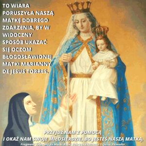 Rozważmy, jak miasto Quito i jego najstarszy konwent, klasztor Koncepcjonistek, również doświadczyli specjalnych łask Matki Bożej Dobrego Zdarzenia, która w 1610 r. w cudowny sposób objawiła się Matce Mariannie od Jezusa Torres, jednej z hiszpańskich założycielek tego konwentu, istniejącego wówczas od 33 lat. Ta szczęśliwa i pobożna siostra modliła się samotnie z czułym nabożeństwem, błagając Matkę Bożą pod tytułem Dobrego Zdarzenia, o łaski potrzebne dla swojej własnej duszy, dla swoich klasztornych sióstr i dla rodzaju ludzkiego. W ferworze swoich modlitw, czynionych z tak głęboką wiarą i ufnością, wzniosła gorliwe spojrzenie ku Niebu, wzywając swoją Matkę, by przybyła jej z pomocą oraz udzieliła jej tego, o co pokornie prosi ze szczerą troską dla dobra konwentu i całego Kościoła Katolickiego.