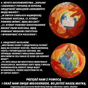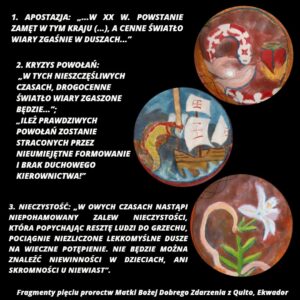 Święta siostra zakonna była jednocześnie przejęta radością i zmieszana, iż jej Niebieska Matka raczyła ją w ten sposób odwiedzić. Jej dusza napełniła się zachwytem i wdzięcznością bez miary, a jej serce zostało zalane świętymi uczuciami. Gdy żywa wiara, niezwykła ufność i głęboka miłość ogarnęły całą Jej istotę zapytała: “Kim jesteś o Pani i czego ode mnie żądasz?”
