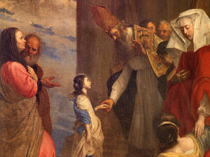 Gdy dotarli do świątyni, na samym początku Maryja uklękła dla ucałowania ziemi, jako znajdując się w domu Bożym, potem głęboką cześć oddała Jego najwyższemu Majestatowi. Złożyła dzięki za łaskę, jaką Jej wyrządzał, skłaniając do zamieszkania przez czas pewien przy Jego przybytku i zaofiarowała się mu najzupełniej, bez żadnego wyjątku, poświęcając mu wszystkie swoje władze i zmysły, wszystek swój umysł i serce, duszę i ciało. Miała wtedy bowiem zamiar pozostania na wyłącznej służbie Pana w świątyni przez całe życie, gdyby taka była wola Boża oraz już nigdy tego miejsca nie opuszczać. Święty Hieronim i święty Bonawentura podają nam więcej szczegółów: