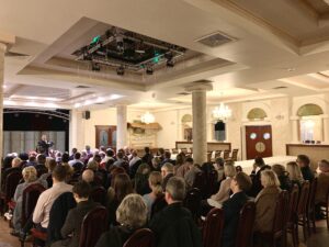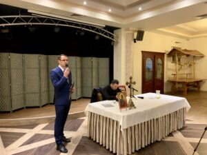 Nasz czcigodny Prelegent rozpoczął wykład od przedstawienia zewnętrznych objawów kryzysu w Kościele, aby uwypuklić cel i sens życia człowieka na tym, pełnym kłamstw świecie. „Ujawniający się kryzys w Kościele to nieosiąganie właściwego celu życia człowieka” – powiedział. Na czym więc polega cel i sens życia człowieka na ziemi? Pan Bóg stwarzając świat pragnie, aby człowiek przez „pielgrzymowanie” na ziemi stał się „obywatelem nieba”, osiągnął wieczność, a wraz z nią niesamowitą radość i szczęście: „Ani oko nie widziało, ani ucho nie słyszało, ani serce człowieka nie zdołało pojąć, co Pan Bóg przygotował tym, którzy Go miłują”. Taki więc plan przygotował Pan Bóg dla człowieka, a ten, zwiedziony przez Lucyfera, wybiera inną drogę i zaciąga na całą ludzkość grzech pierworodny. W tym to momencie przychodzi na świat Zbawiciel – Jezus Chrystus, który zakłada Królestwo Boże na ziemi – Kościół katolicki. Następuje odnowienie tego pierwotnego planu, aby człowieka doprowadzić do właściwego celu –